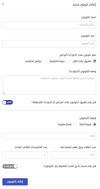 نطاق التطبيق | - التطبيق على الكل: يمكن تفعيل الكوبون لجميع الدورات والبرامج التدريبية. - دورة تعليمية محددة: يسمح بتطبيق الكوبون على دورة معينة فقط. - برنامج تدريبي محدد: يتيح استخدام الكوبون لبرنامج تدريبي معين يتكون من عدة دورات. |