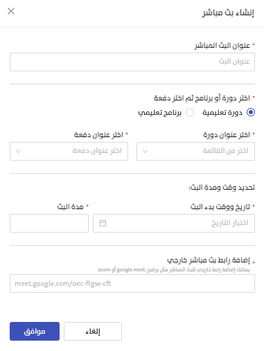 8. إضافة رابط البث الخارجي إذا كان البث سيتم عبر Zoom أو Google Meet.