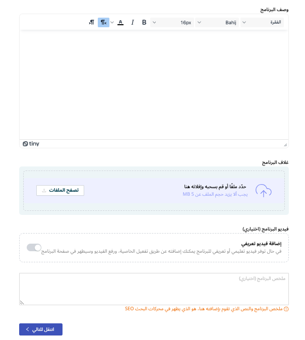 أدخل البيانات الأساسية التي تصف محتوى البرنامج وتعطي انطباعًا أوليًا للمتدربين.