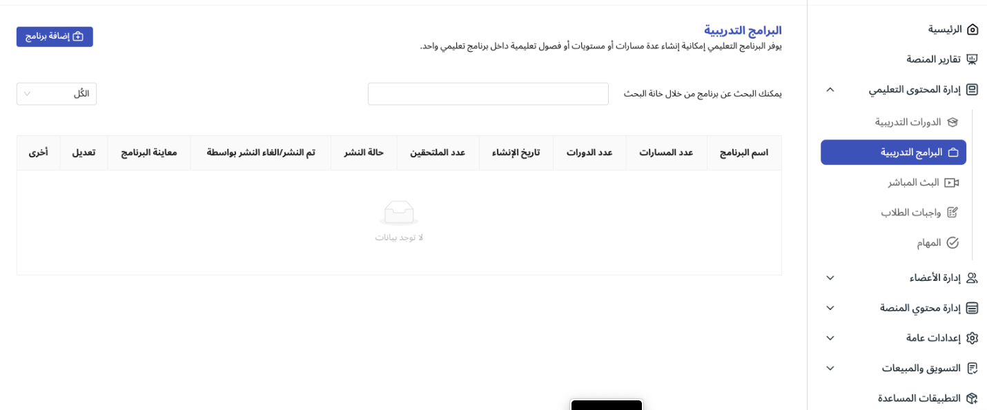 الوصول إلى صفحة البرامج التدريبية: قبل البدء بإنشاء أي محتوى، تحتاج أولًا إلى الدخول إلى واجهة إدارة البرامج التدريبية. من هناك يمكنك الاطلاع على البرامج السابقة أو البدء في إنشاء برنامج جديد.