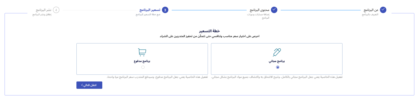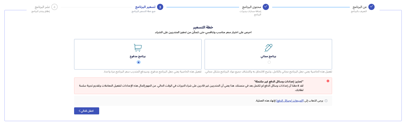 ملاحظة: إذا اخترت "برنامج مدفوع" ولم تكن وسائل الدفع مفعّلة، ستظهر لك رسالة تنبهك بضرورة إكمال إعدادات الدفع أولًا.
