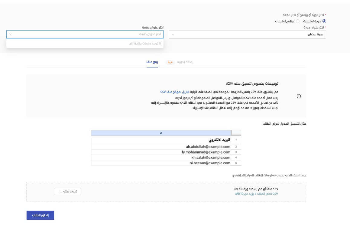 - تحقق من أن البريد الإلكتروني لكل طالب صحيح لتجنب الأخطاء أثناء الإلحاق.