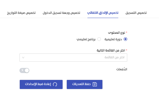 إذا كنت ترغب في تبسيط تجربة المستخدمين، فإن ميزة الإلحاق التلقائي تتيح تسجيلهم مباشرة في دورة تعليمية أو برنامج تدريبي فور إتمام التسجيل. يمكنك التحكم في هذا الخيار وتحديد المحتوى الذي سيتم إلحاقهم به تلقائيًا، مما يسهل عليهم بدء رحلتهم التعليمية دون الحاجة إلى خطوات إضافية.