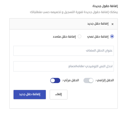 E. بعد الانتهاء من ضبط الإعدادات، اضغط على إضافة حقل جديد ليتم إضافته إلى نموذج التسجيل مباشرةً.