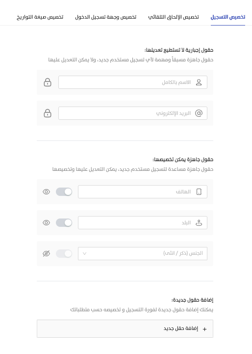 يعد تخصيص التسجيل من الخطوات الأساسية لضمان جمع المعلومات الصحيحة من المستخدمين الجدد. يتيح هذا القسم إمكانية تعديل الحقول المطلوبة عند تسجيل المستخدمين، سواء كانت إجبارية أو اختيارية، بالإضافة إلى إمكانية إضافة حقول جديدة حسب احتياجات المنصة.