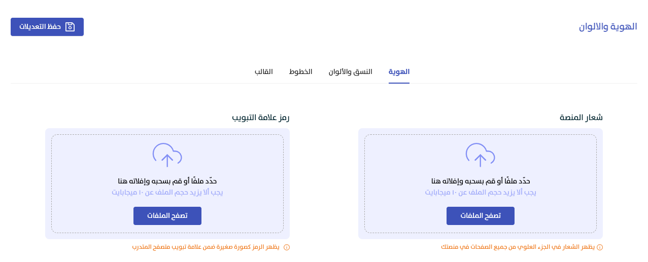 يُعد شعار المنصة ورمز علامة التبويب جزءًا أساسيًا من هوية منصتك، حيث يساعدان في بناء التعرف البصري لمنصتك ويجعلانها تبدو احترافية. يمكنك بسهولة تحميل وتخصيص هذه العناصر لضمان تناسقها مع علامتك التجارية.