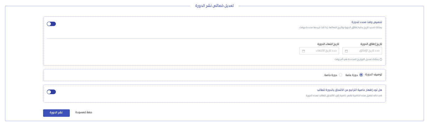 توفر مرحلة النشر إعدادات متقدمة مثل حفظ البرنامج كمسودة أو تخصيص التصميم البصري لصفحة العرض. لتعديل خصائص نشر البرنامج يرجى اتباع الخطوات التالية: انتقل إلى المرحلة الرابعة "نشر البرنامج". يمكنك تعديل ما يلي: نشر البرنامج فورًا عبر زر "نشر البرنامج". ...