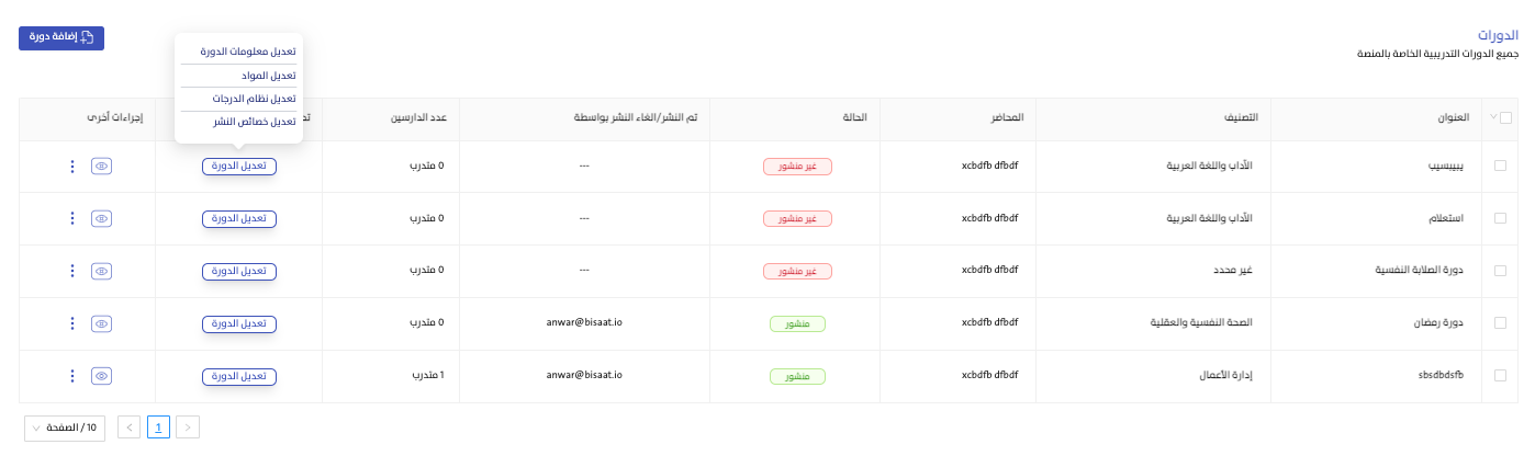 لإضافة أو تعديل المحتوى التعليمي للدورة، يرجى اتباع الخطوات التالية: انتقل إلى "الدورات التدريبية" " تحت قسم "إدارة المحتوى التعليمي" وابحث عن الدورة المراد تعديلها. اضغط على "تعديل الدورة". 3. من القائمة المنسدلة، اضغط على تعديل المواد 4. انتقل إلى ...