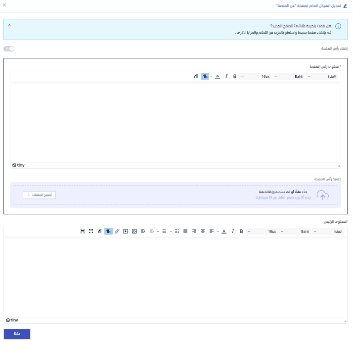 بعد إنشاء الصفحة، يمكنك تعديل محتواها وهيكلها عبر المحرر المدمج داخل النظام، ولتعديل احدى صفحات المنصة، يرجى اتباع الخطوات التالية: